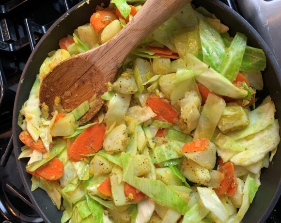 - Meanwhile, heat oil in a sauté pan. Sauté carrots and onions until they begin to soften, about 5 minutes.Stir in ginger, garlic, cumin and turmeric. Cook until fragrant, about 1 minute.Stir in cabbage, salt, pepper and par-cooked potatoes. Cook until cabbage and potatoes are tender, about 5 more minutes.