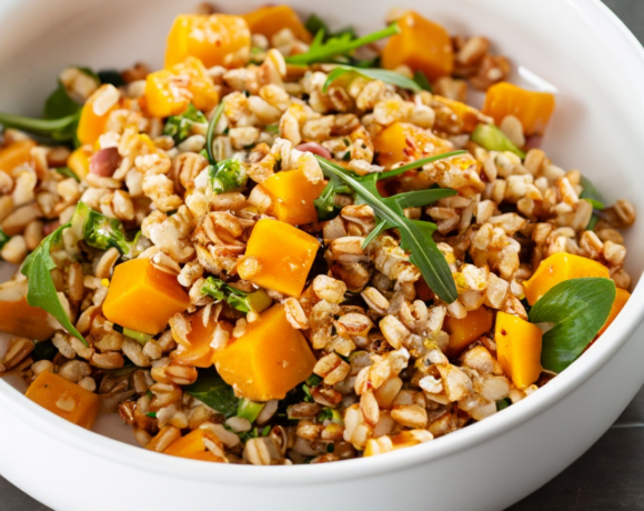 Honey Roasted Butternut Squash with Farro, Pumpkin Seeds, and Cider Vinaigrette
