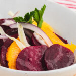 A vibrant beet salad featuring roasted beets, crisp fennel slices and juicy orange segments.