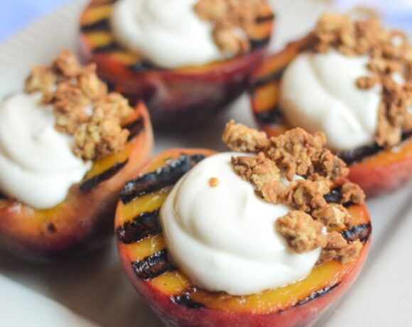 Grilled Peaches with Vanilla Greek Yogurt, Honey, and Oat Crumbles