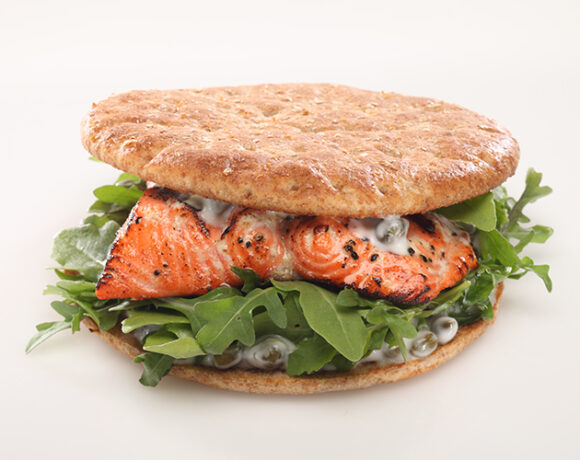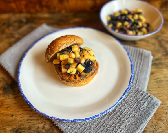 BBQ Spiced Chicken, Black Bean, & Sweet Potato Burger with Blueberry Pineapple Salsa