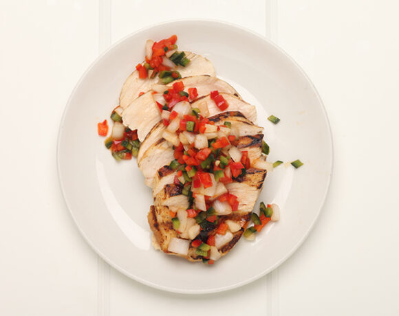 - For the chicken: Pre-heat oven and pre-heat grill to medium high heat. Brush chicken with olive oil and season with salt and pepper. Place chicken onto the grill and cook for approximately 4 minutes on each side. Place the chicken on a sheet pan and place in the pre-heated oven until it’s cooked through and the internal temperature reaches 165F degrees.