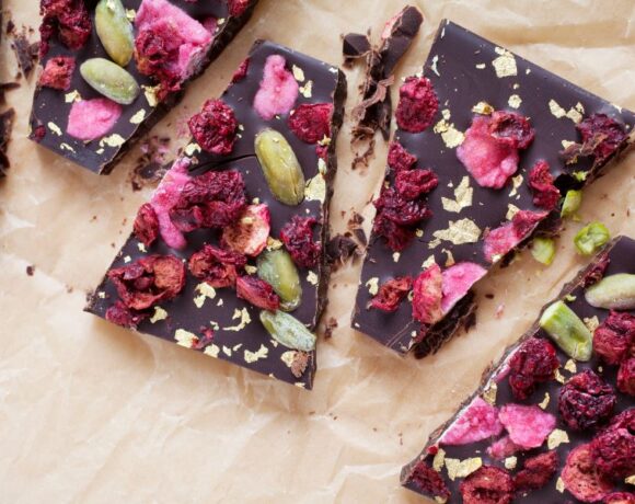 - Sprinkle with pistachio, dried cherries and sea salt. Chill in fridge until completely set, about 30 minutes.