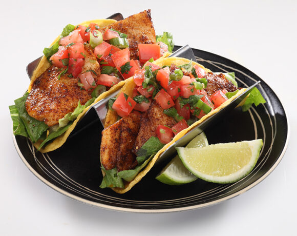 - Wrap tortillas in foil and warm for about 3 minutes in oven. In each tortilla, add 3 tablespoons of salsa, 2 oz of fish and 1 tablespoon of lettuce. Enjoy!