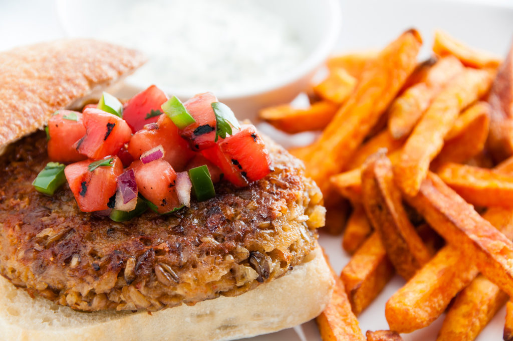 - In a sauté pan, heat second listed oil and cook the patties to a golden brown, flipping halfway through, about 4 minutes per side. Serve immediately on toasted wheat buns with lettuce and tomatoes.