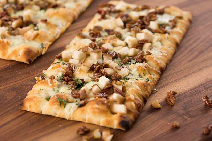 Sweet and savory flatbread with gorgonzola, pear, balsamic honey, and walnut