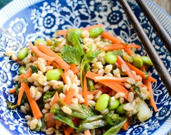 - Add scallions, cooked farro, mint, edamame, and carrots and toss until evenly coated.