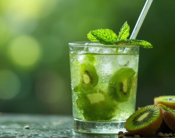 - Wash mint leaves and set aside. Peel and thinly slice second kiwi into circles.Fill cup with ice, fille with cold kiwi water and garnish with sliced kiwi and mint.