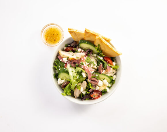 - -In the bottom of an entrée salad bowl, arrange 1-1/2 cups of spring mix.-Next, place 3 pita triangles at top of bowl.-Then sprinkle the salad with 3 cucumber slices, 1 tbsp. of pickled red onion, 1 tbsp. of feta, 6 halves of grape tomatoes and 6 halves of Kalamata olives.-Serve with 2 oz. salad dressing on the side.