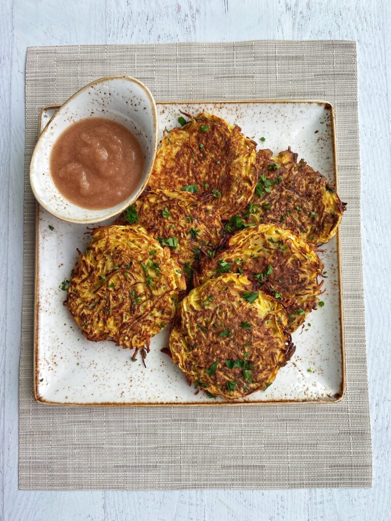 - Heat pan to medium-high heat and spray with cooking oil spray. Scoop to portion a 3 oz. latke and sear until golden brown on both sides. Finish latkes in the oven if needed at 350F, until internal temp reaches 155F.Serve with a side of applesauce.