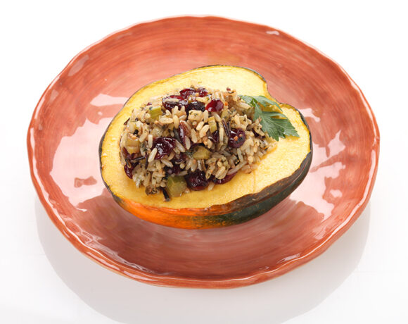 Maple glazed acorn squash stuffed with wild rice and cranberry stuffing with pecans