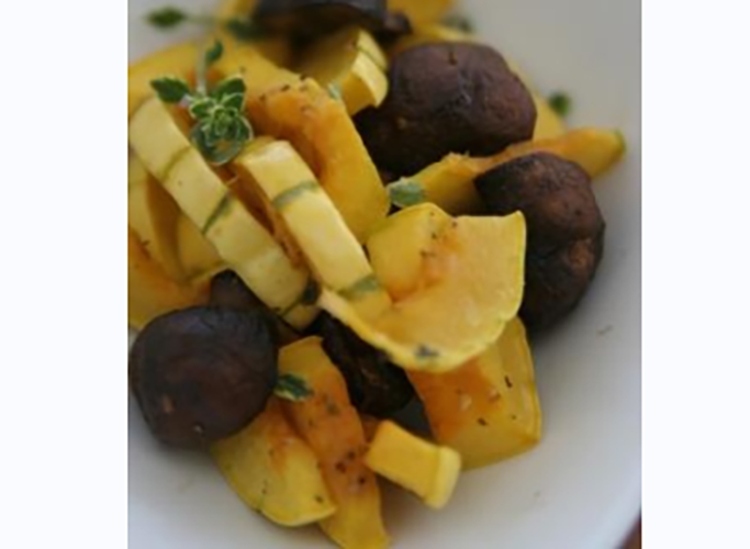 - Preheat oven to 350°F. Wash delicata squash, cut in half lengthwise, scoop out seeds and discard. Slice 1/2" thick and place in a bowl. Remove stems from mushrooms (slice in half if large) and place caps in a different bowl. Divide into each bowl olive oil, garlic, salt and pepper. Place the squash on pan and the mushrooms on another pan. Roast in the oven until tender, about 10-15 minutes. When cooked through, combine vegetables and toss with fresh thyme leaves.