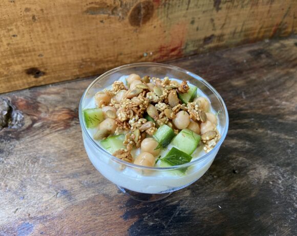 - To combine parfait: In a bowl, toss together garbanzo beans, olive oil, cucumbers, dill, salt, pepper, and lemon juice.Layer:~1/2 cup Greek yogurt ~ 1/4 cup cucumber chickpea salad~1/4 cup granola