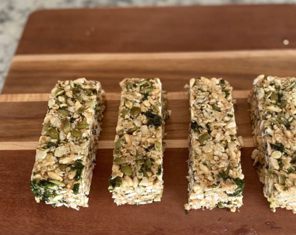 - In a bowl, mix oats, puffed brown rice, kale, toasted pepitas, and maple syrup mixture. Stir until evenly mixed.Spray a sheet pan with cooking spray. Using a rubber spatula, firmly press mixture into pan and bake in a 350F degree oven until very golden brown and crisp, about 10-15 minutes. Then cut into bars.