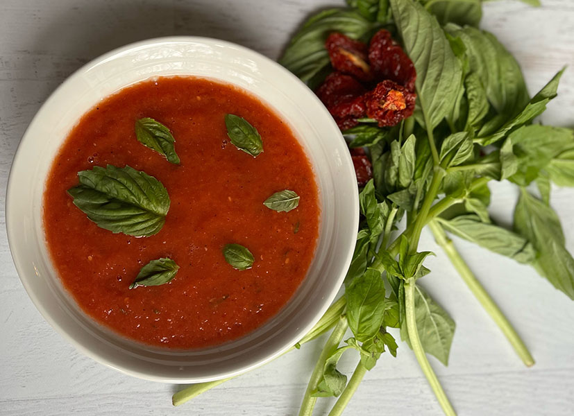 - In a blender, combine tomatoes, red wine vinegar, Dijon mustard, tomato paste, chili flakes, salt and pepper.While blender is running, drizzle in olive oil until emulsified.Stir in basil.