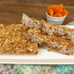 Homemade granola bar with apricots, chia, oats, and cinnamon