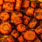 Rinse uncut produce in fresh water. Do not peel carrots. Slice the carrot on the bias into 1/4” pieces. Add cumin, chili powder, brown sugar, olive oil, salt and pepper to a bowl with the carrots. Toss to combine spices and coat the carrots well.