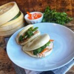 Steam bao buns according to package directions for 5 minutes then fill each steamed bun with: sliced pork, pickled vegetables, and sriracha light mayo. Garnish each with a cilantro sprig.