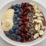 To assemble: Place 12 ounces of smoothie base into a bowl. Top with 1 ounce each of sliced banana, blueberries, pomegranate seeds, and 1 tablespoon each of sliced almonds and cacao nibs. Serve immediately.