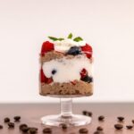 In a 9oz cup, layer 1/4 mocha chia pudding base, 2 tbsp berries, 2 tbsp yogurt, and repeat layers. Garnish with a sprig of mint on the last layer.
