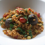 Add the vegetable stock along with the peas, tomatoes and mushrooms. Stir, cover and cook in the oven for 15 minutes. Take a peek and add more broth if the rice looks dry and stir if necessary. Keep uncovered and cook another 5 minutes. Season with salt and black pepper.